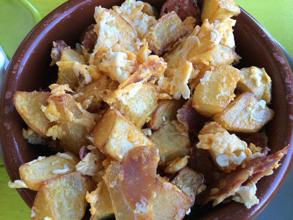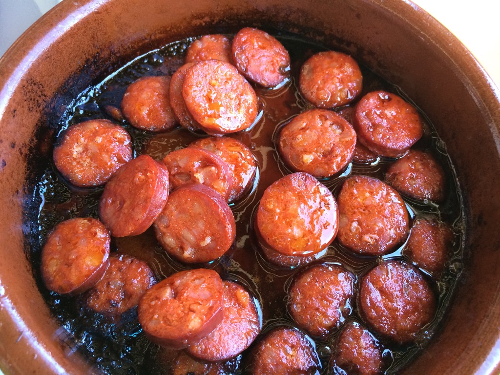 Maribel brought out a tapa of a fresh tortilla for us to taste whilst deciding on the menu, I had to try the chorizo cooked in honey rum and Miguel loves black pudding, so selected the morcilla, plus a racion of papas bravas and papas Gullivers. Maribel also brought a taster of marinated pork and some slices of fresh goats cheese to the table whilst our order was being prepared.