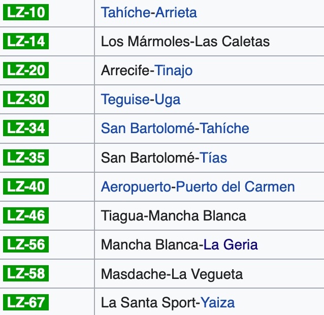 There are 11 of these “Green” roads in total, and they have two digit numbers, for example, LZ10 or LZ56. Some are quite long, for example LZ67 which runs from La Santa to Yaiza is 24 KM long, and some are very short, for example the 2.2 KM LZ14 from Los Marmoles to Las Caletas.