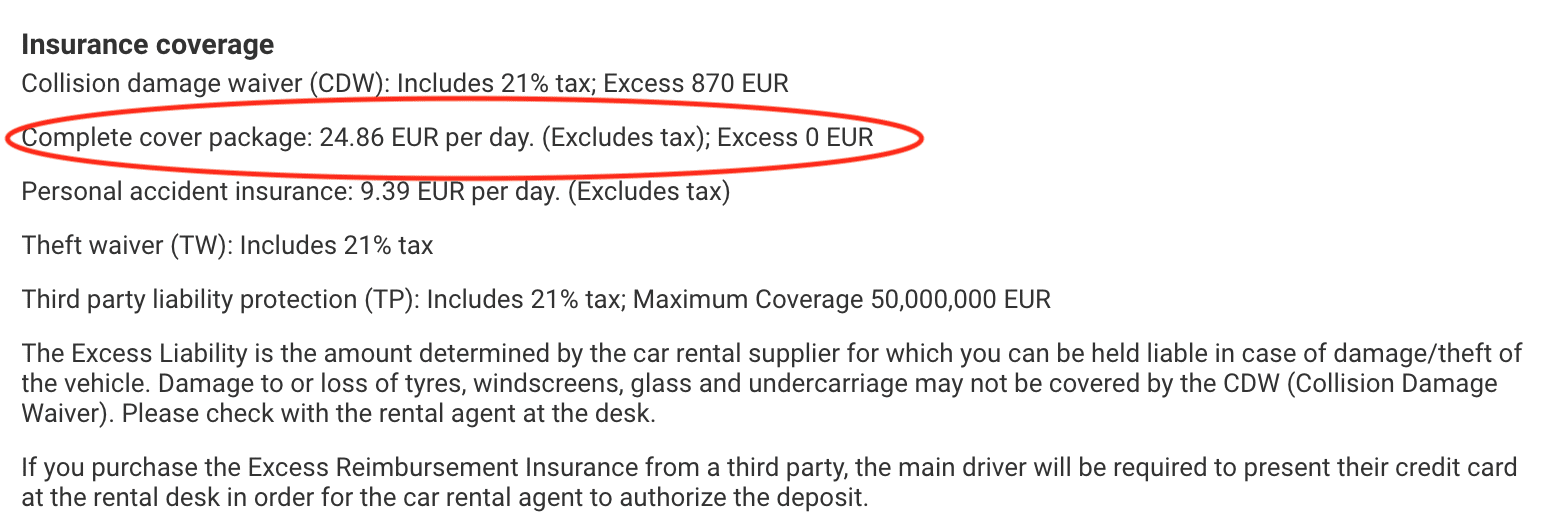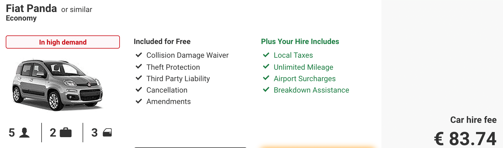 Pretty impressive. The dates we’d gone for are for the highest season, and that’s a lot cheaper than our own car hire offer, which is €119. So we started to dig, to find out what is included.