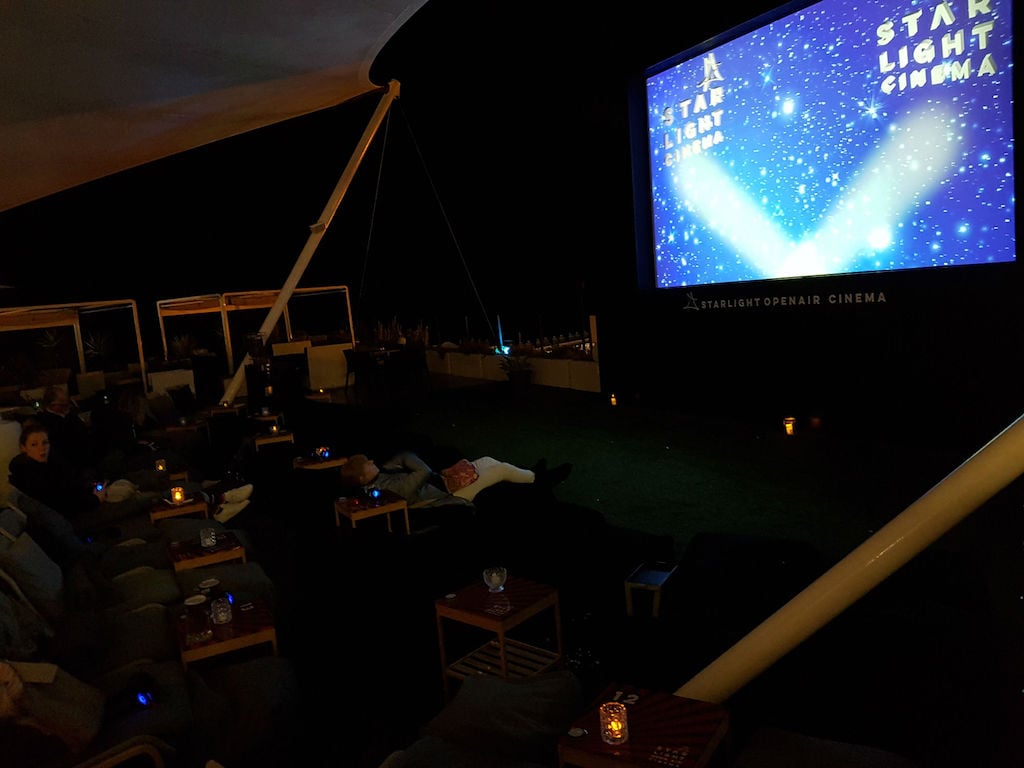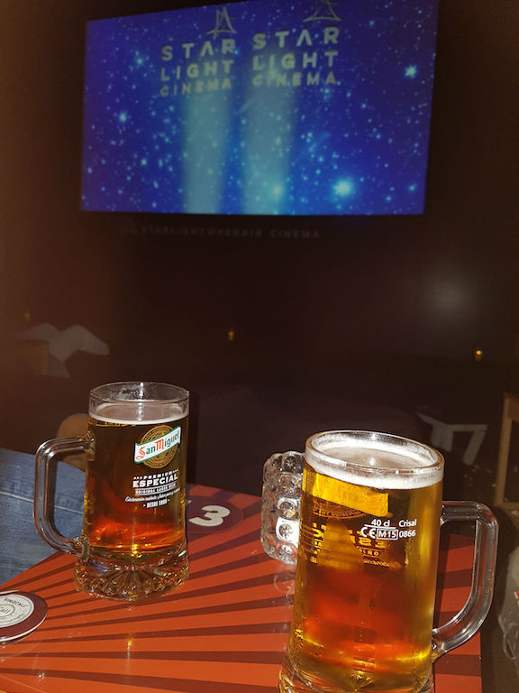 We took our beer in with us, and we were told to just press the call button on the table if we wanted more drinks. It was quite cool the night we went, but there were blankets for our use with which we were very snug. There are also patio heaters to keep the chill off. The high-quality headphones have individual volume controls and the language can be changed between English and Spanish. We watched Dunkirk and having the volume set high really makes you feel at the centre of the action.