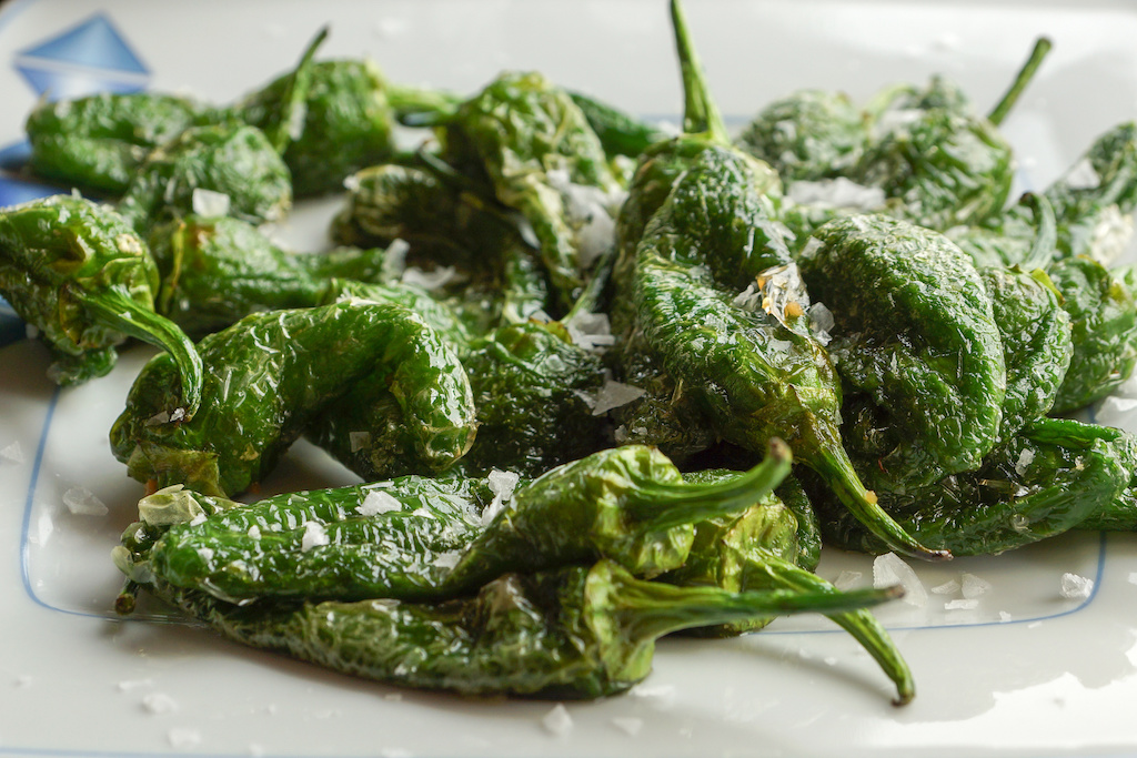 These are small green peppers which are flash cooked on a very hot griddle until almost charred. Served drizzled with olive oil and salt crystals, they are delicious, but every now and then you’ll find a hot one!