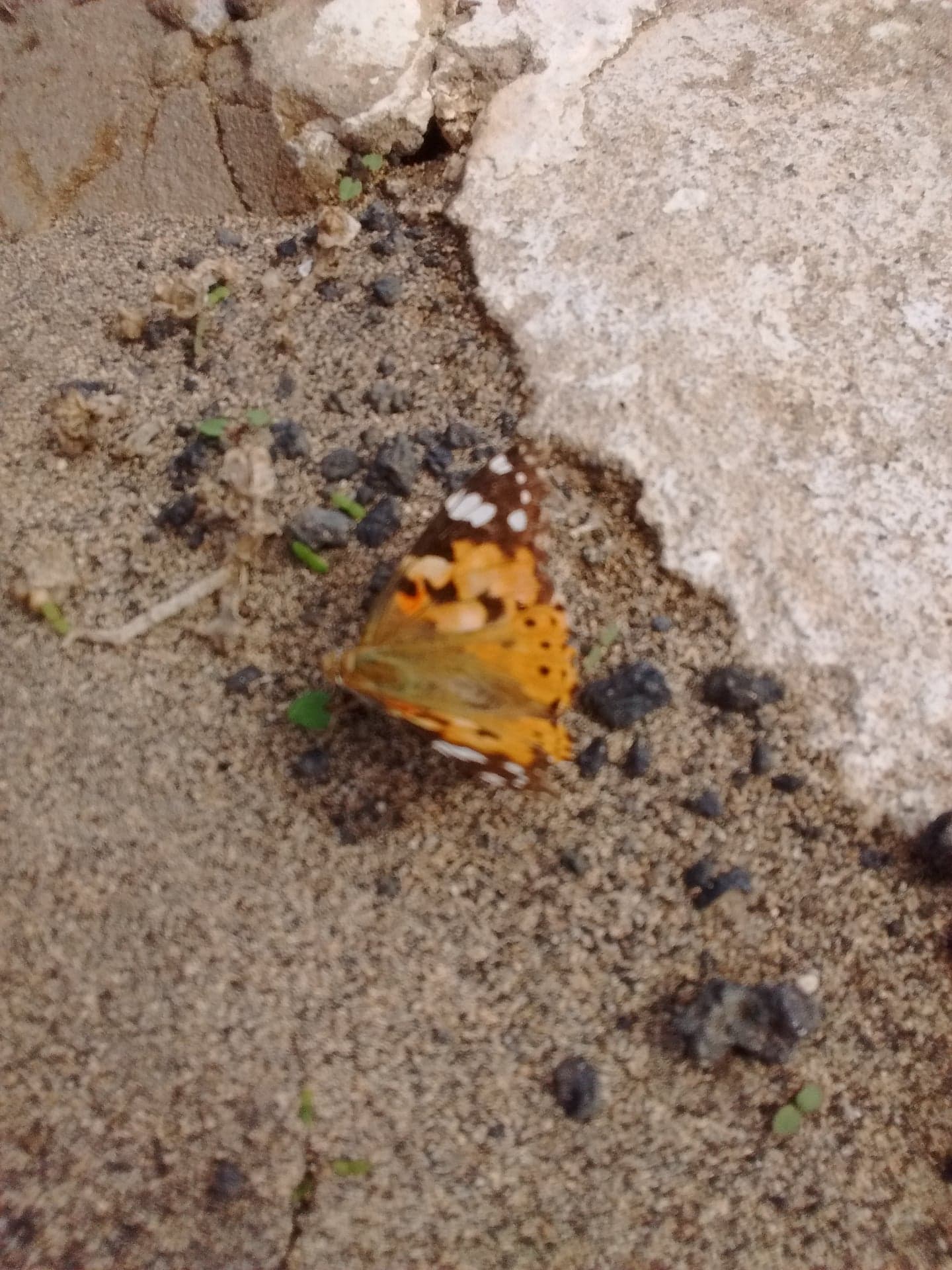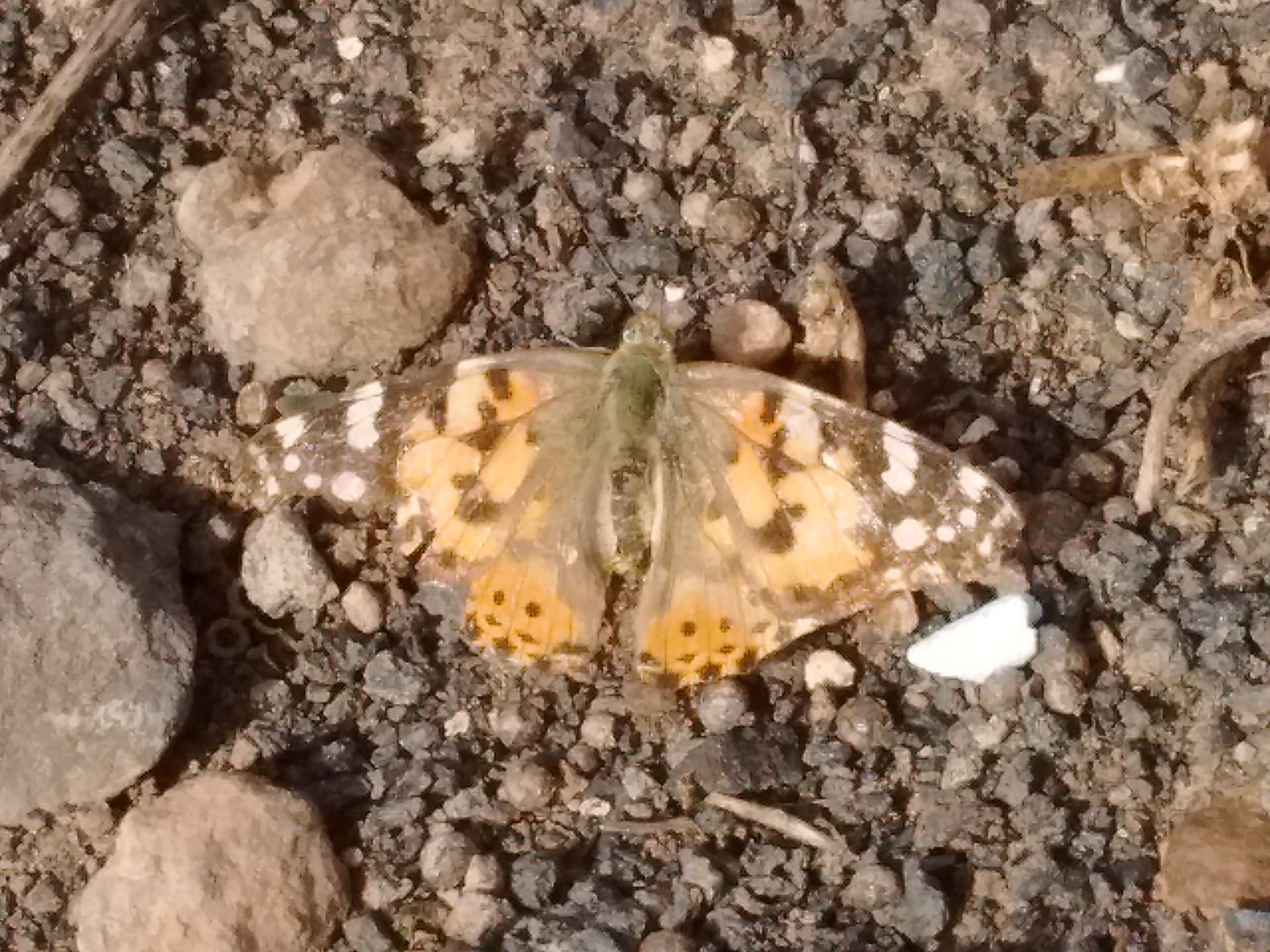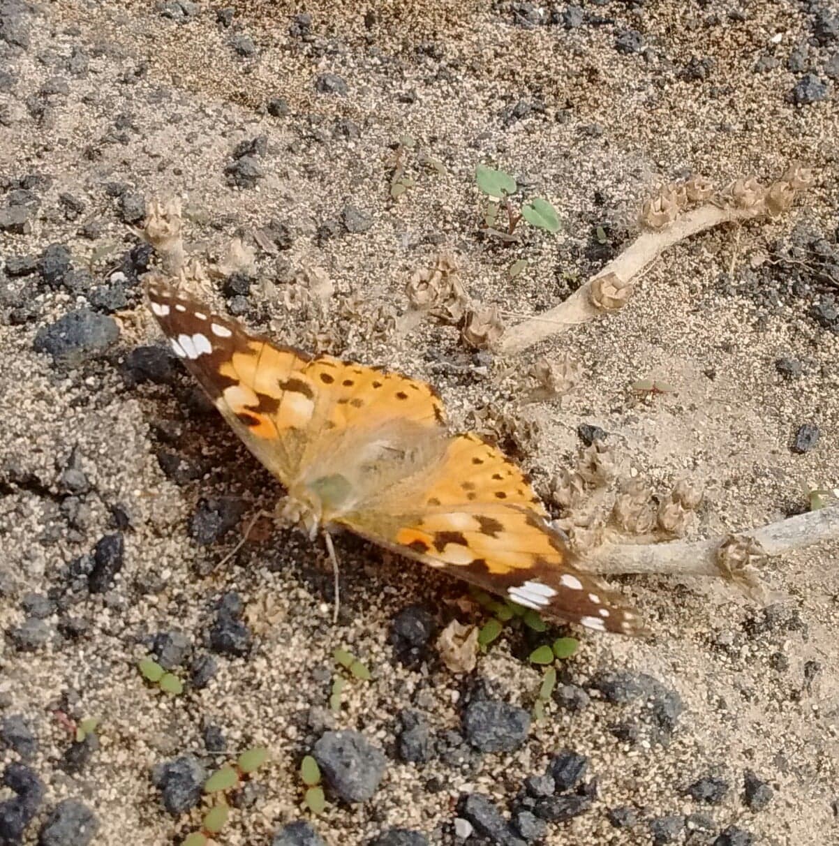 The Monarch butterfly markings look more of “Tiffany-glass” , whereas the Painted Lady has less defined orange areas and more brown and beige bits around the body and the lower part of its wings. The colours are much more muted on the underside of its wings to the point that they can hardly be seen, camouflaging perfectly with the Lanzarote colour palette.