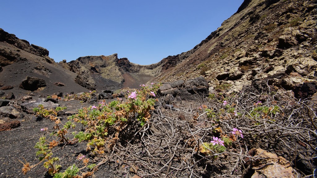 Inside, it is difficult to imagine the sheer scale of the forces that made this peak rise out of the earth while spitting out the lava which surrounds it. But now, even in the scorching heat of summer, fragile flowers grow in this hostile environment showing that life can return in even the harshest conditions. Shrubs have also forced their way through the seemingly barren sides of the volcano.