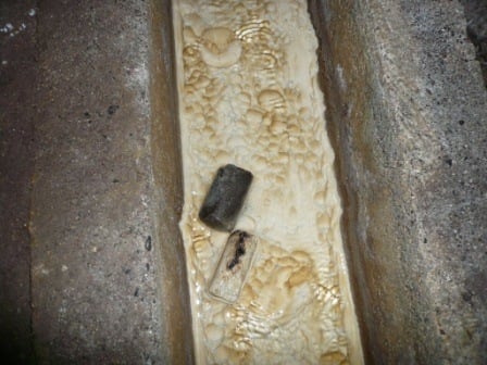 We made our way deeper into the tunnel, along the right hand side above the water channel was a pipe that had fallen to the floor where the wires and hooks holding it had rusted through.