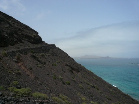 We jumped in David’s jeep “Anibal” and followed the dirt track around the back of the bungalows to the section of beach allocated to kite surfing. We set off along an uphill track affording us some lovely views back to Famara and over the sea to La Graciosa.