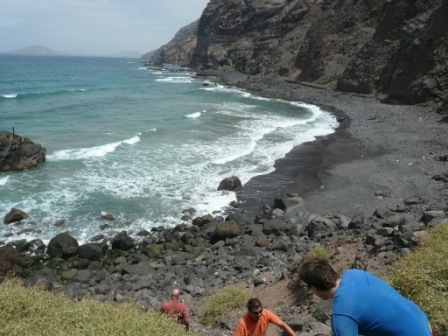 When we finally reached a black stony beach, we saw evidence of a train track, a pipe stretching along the coast back to Famara and even some rusted wheels from a train. At the far end of the beach there were holes drilled into the rock face but what were they testing for?