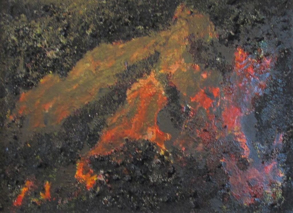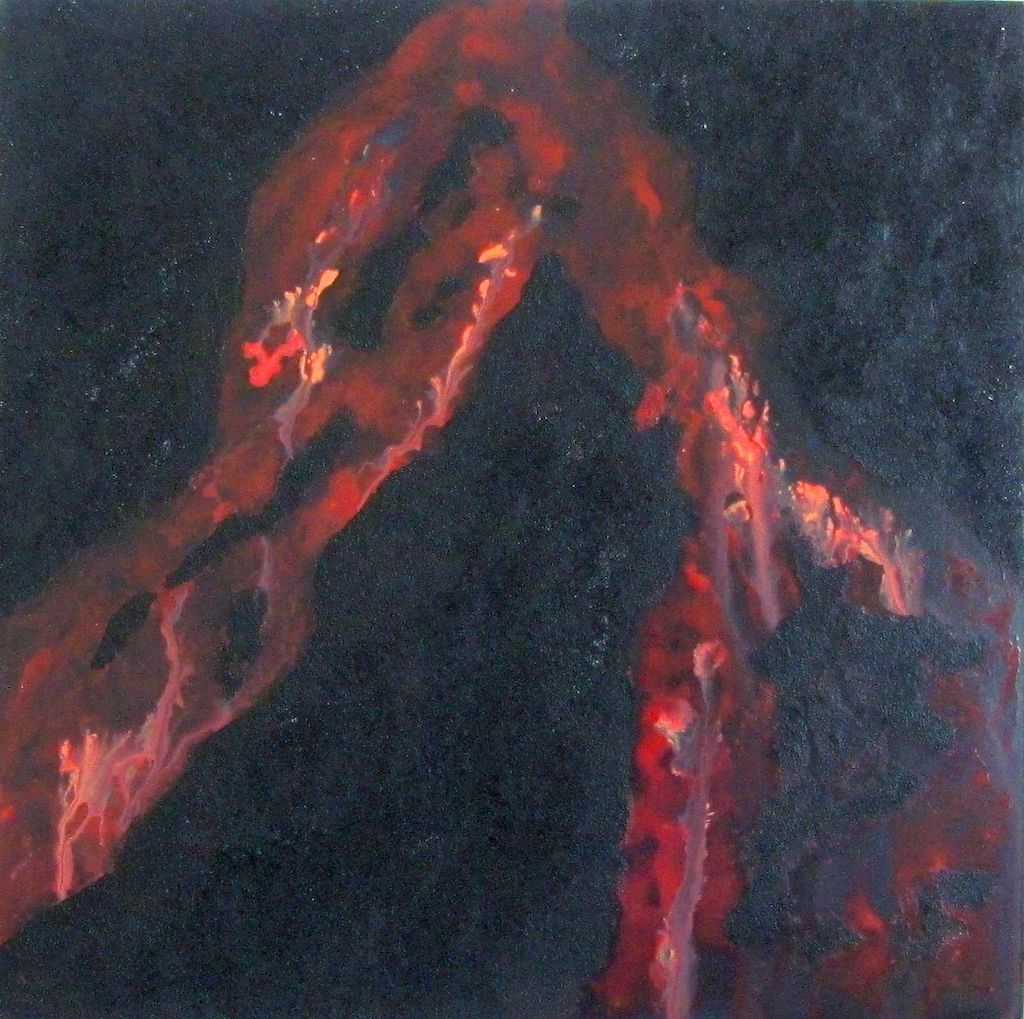 Sigrid has therefore begun to explore the fissures, eruptions and lava flow in a series of paintings that seem to us at Sidetracks And Detours, even in these second-generation reproductions to capture a heat and a ferocity and inevitability that could not be withstood.